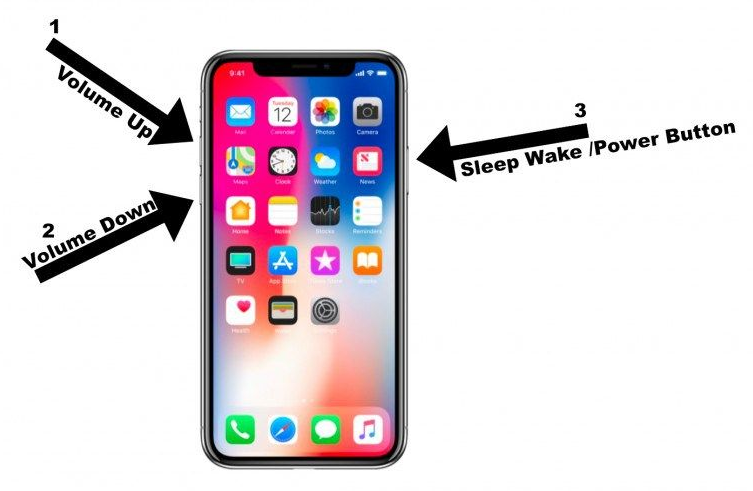 4. Håll inne VOLYM NER och PÅ/AV-knappen i ca 15 sekunder (se bild nedan) tills telefonen visar ett APPLE-loggan efter ca 15 sekunder.