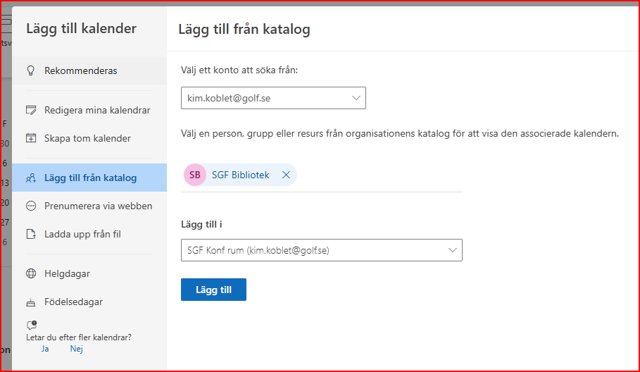 - Skapa en kalendergrupp för "SGF Konferensrum" och lägg till konferensrum från katalogen